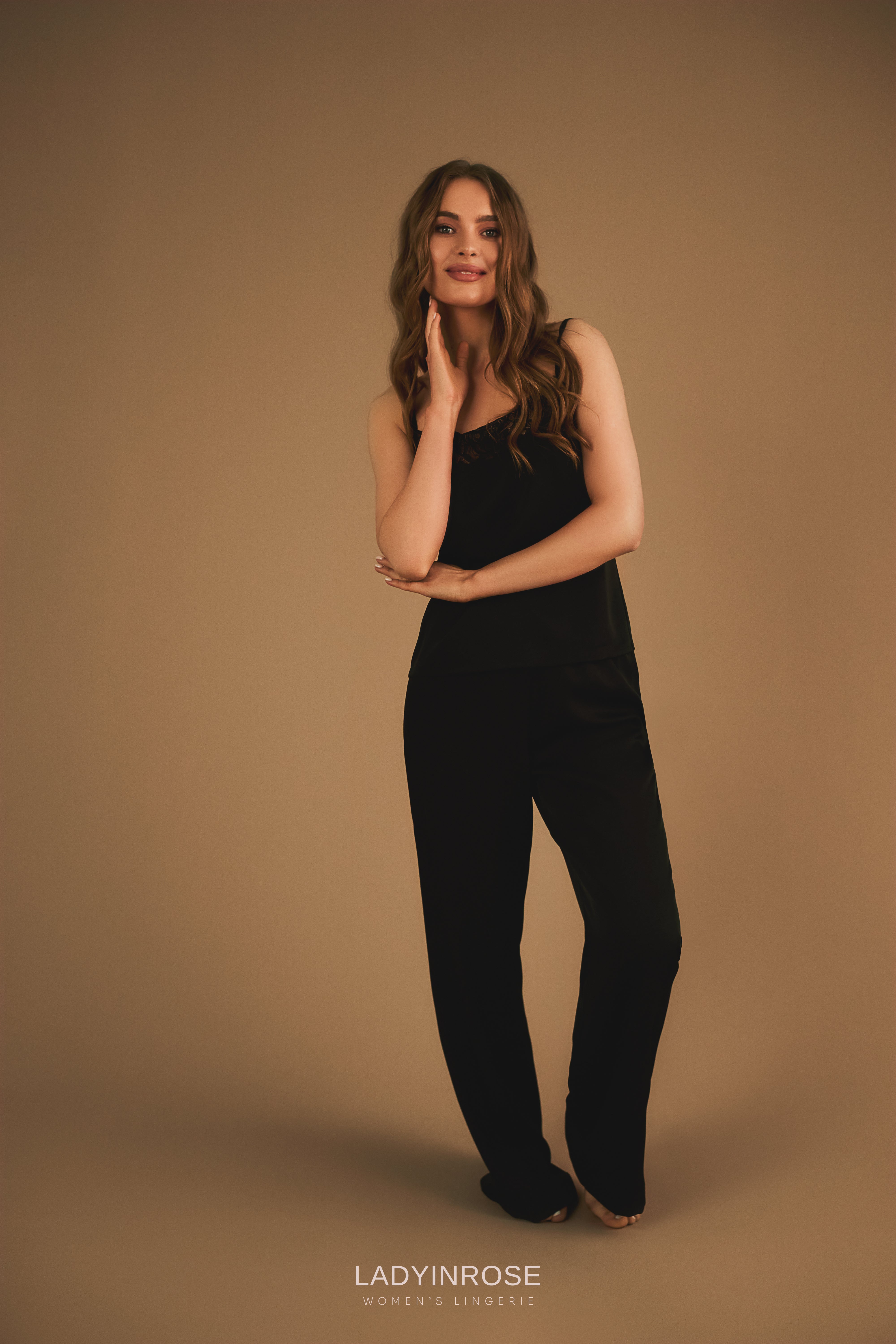 Tessa is the perfect blend of minimalism, elegance, and comfort. This black silky satin set is made for women who appreciate understated luxury. A lightweight camisole with delicate lace and thin straps adds a touch of softness, while the loose-fit pants provide comfort throughout the day. Ideal for relaxing at home or spending stylish evenings indoors, Tessa is for those who know that true beauty lies in simplicity.